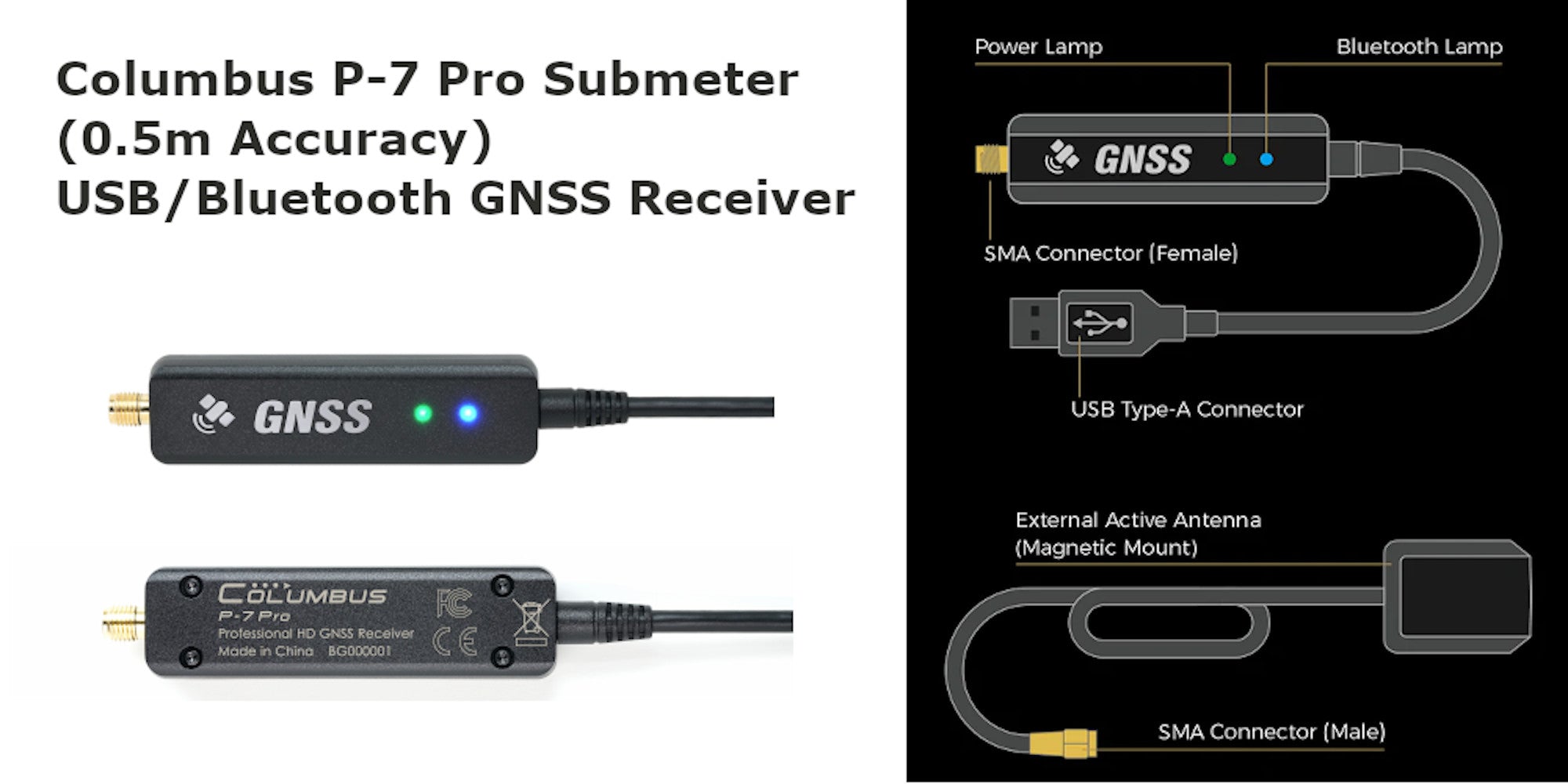 Columbus P-7 Pro Submeter (0.5 meter accuracy) USB and Bluetooth GNSS Receiver