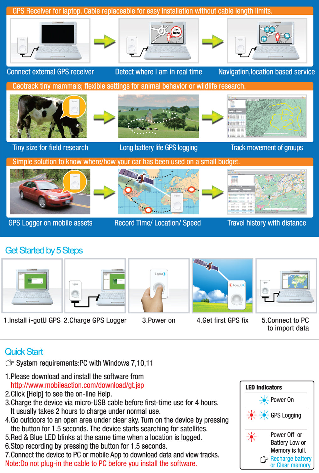 GT-120B can be used as an usb GNSS receiver with 1-10Hz update rates. When used as a GNSS data logger, the update rate is 1 Hz.