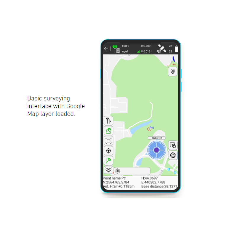 In both survey and stakeout functions interface, we have designed a rich and customizable information bar and toolbar. Users can customize the information and tools they need based on their personal preferences and measurement requirements. The most commonly used tools include tilt survey, jump to map center, and display map.